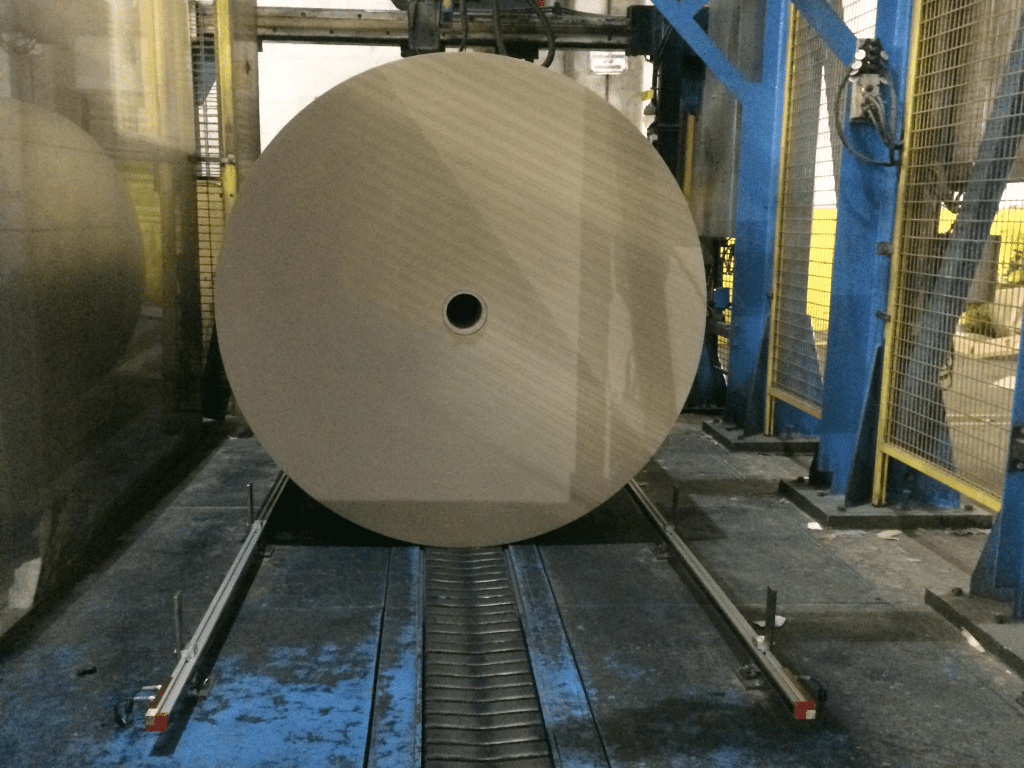 Paper rolls are transported to the warehouse via chain conveyors after wrapping. Prior to storage, the rolls of paper are measured in width while passing through. This happens without contact and very precisely with the ELOVIS length-section light scanner. The ELOVIS SLM gauge is robust, not dust-prone and provides the important width information before the vertical storage of the role.