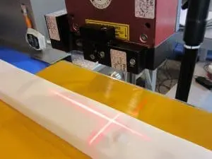Al serrar y cortar materiales extruidos, como tuberías, mangueras y perfiles, es esencial la medición sin deslizamientos para que longitud de corte sea lo más correcta posible. En su mayoría se utilizan sierras de corte al vuelo, se logra la mayor precisión. La salida de los impulsos del codificador para el control del gatillo o para controlar la sierra, la guillotina o el punzón es más fácil y precisa con el codificador láser sin contacto μSPEED.